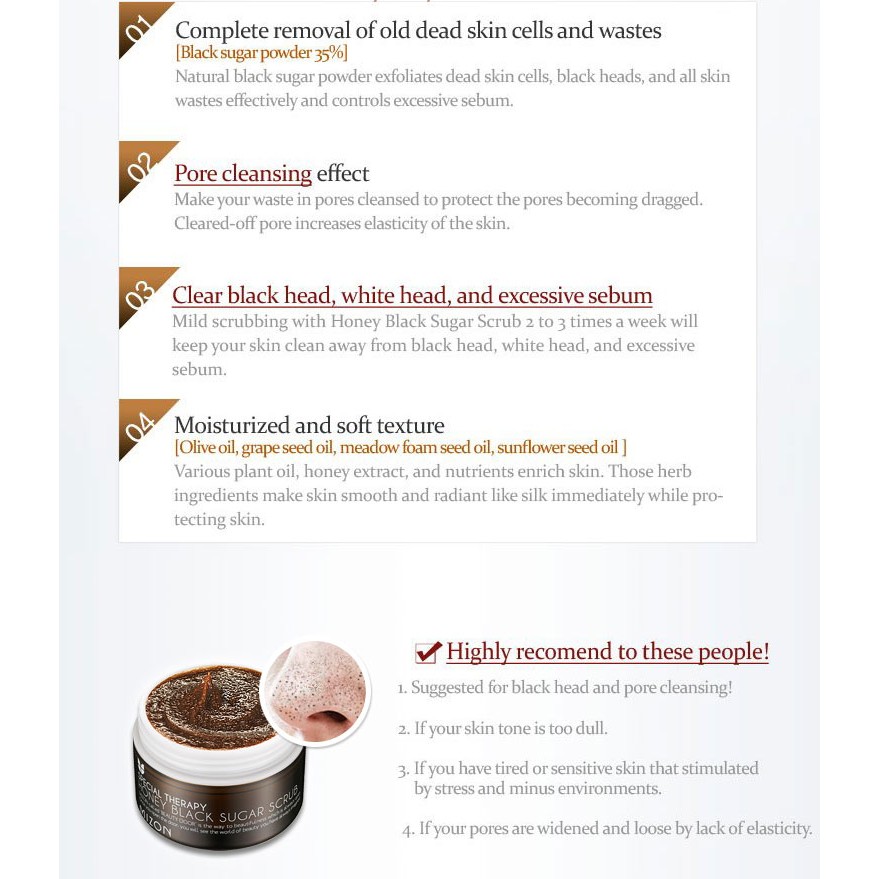 Black sugar dipped in honey exfoliates while effectively removing blackheads. Promotes cell activation and clarification by softly melting skin impurities from within the pores. 5222020 Benefits of Honey Sugar Scrub Honey.